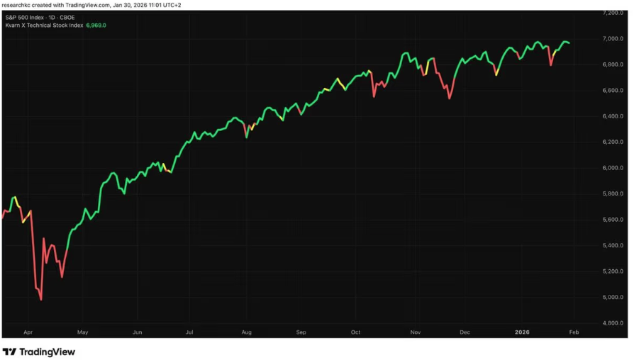 Myös Kvarn X Technical Stock Index on kääntynyt nousutrendiin viittaavaan vihreään väriin.
