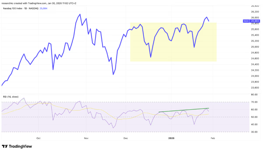 Kuluneen viikon aikana Nasdaq 100 kohosi viime kuukausien “rangensa” yläpuolelle, ja kävi hetkellisesti jo yli 26 000 pisteen.