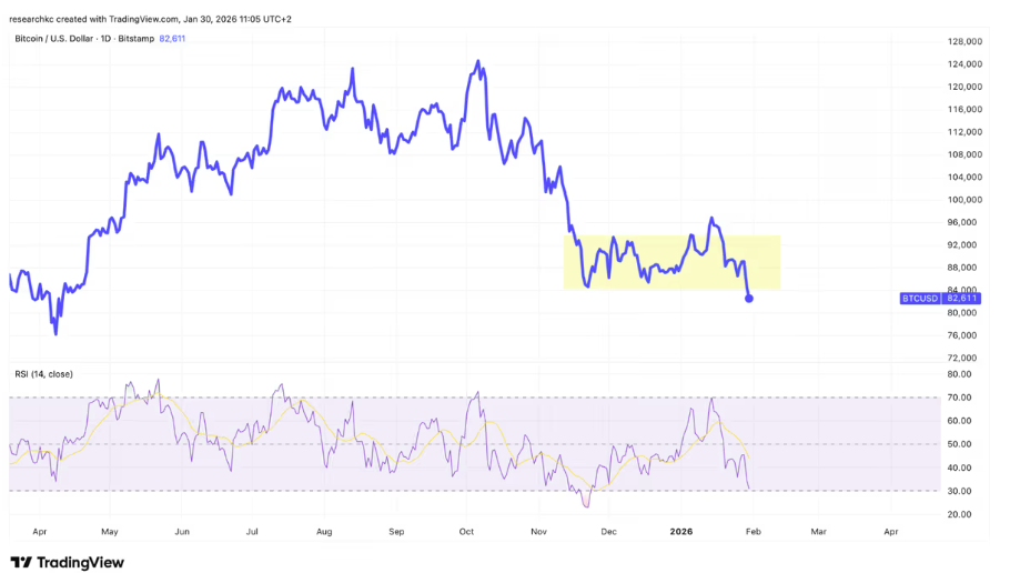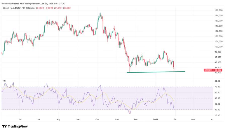 Mikäli tilanteesta haluaisi vielä tehdä optimistisen tulkinnan, voisi sellainen löytyä siitä nyanssista, että toistaiseksi kurssi on hienon hienosti pysynyt marraskuussa nähdyn hetkellisen pohjan (noin 80 500 dollaria) yläpuolella.