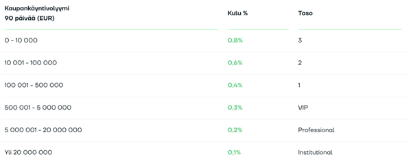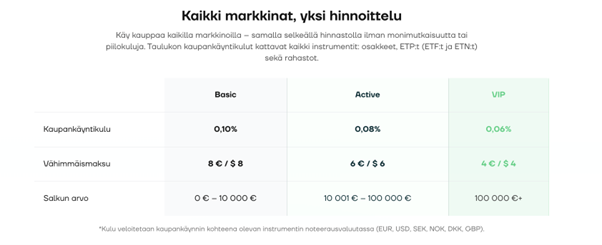 Krypto- ja kultakaupankäynnin hinnasto on myös kilpailukykyinen ja selkeä. Kussakin toimeksiannossa minimikaupankäyntikulu on 1 € per toimeksianto.