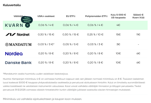 Osake- ja ETP-tuotteiden hinnoittelu on tehty selkeäksi. Kvarn X:ssä on myös tällä hetkellä hinnastokampanja huhtikuun 2026 loppuun asti. Kaikki toimeksiannot 0,06 % tai 4 € min. per toimeksianto.