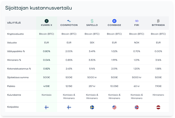 Kvarn X pärjää myös vertailussa muihin perinteisiin toimijoihin. Tarkoituksena on tehdä sijoittamisesta mahdollista kaikille ja yksinkertaista sekä ymmärrettävää.  Alla vertailu alan muihin toimijoihin sekä arvopaperien että kryptovarojen puolella.