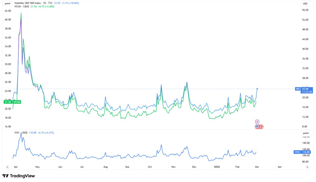 - Jos front VIX nousee 3 kk VIXin yläpuolelle (backwardation), se kertoo usein, että suojausta ostetaan nyt heti (lähikuukausien riskistä maksetaan enemmän).