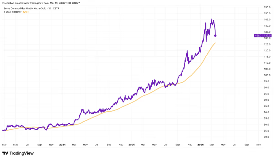 Aloittaaksemme heikoimmasta päästä, käsittelemme ensimmäisenä kullan kurssikehitystä. Käytämme referenssinä kultaan sijoittavan ETC-instrumentin Xetra Gold (4GLD) kurssia.
