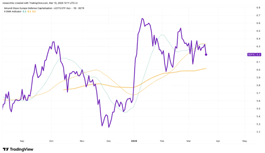 Toinen lyhyen aikavälin momentumin puutteesta kärsivä teema on puolustussektori. Tämän sektorin ETF-rahaston Amundi STOXX Europe Defense (EDFS) kurssi on jäänyt poikittaisliikkeeseen liukuvien keskiarvojensa väliin.