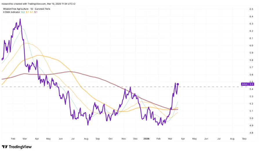 Siinä missä energiasektori näytti meistä helmikuussa kenties kiinnostavimmalta sijoitusteemalta, tämän hetken kiinnostavimmaksi teemaksi nostamme maataloushyödykkeet. WisdomTree Agriculture ETF-rahaston (AIGA) kurssi on juuri ohittanut loppuvuoden 2025 paikallisen huipun, ja näyttää valmiilta noususuuntaan.