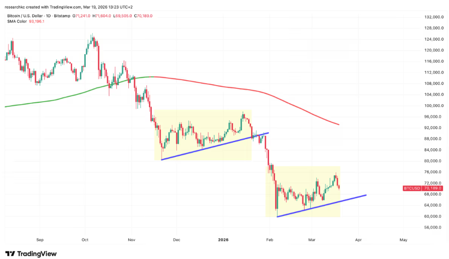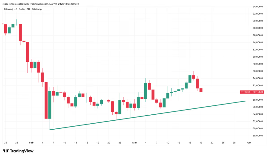 Sijoitusmarkkinoiden yleisessä “risk-off” -tunnelmassa kryptovaluuttamarkkina on pysynyt yllättävänkin resilienttinä. Suurimman kryptovaluutan, bitcoinin, kurssi kävi tiistaina ylimmillään noin 76 000 dollarissa. Keskiviikkona osakemarkkinan jyrkän laskupäivän myötä kurssi on laskenut 70 000 dollarin tuntumaan.
