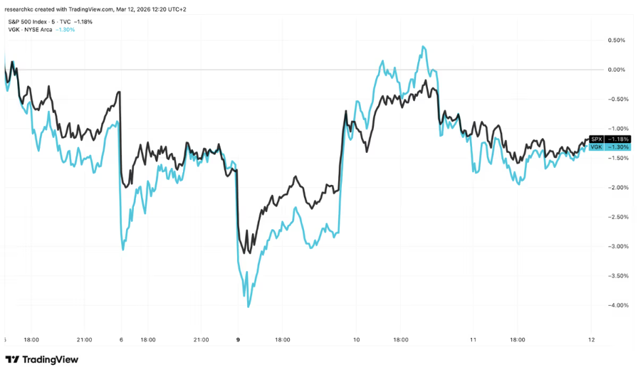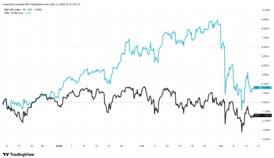 Viikkoa myöhemmin näyttää siltä, että tämä “mean reversion” olisi tältä erää ohi, ja viimeisen viikon aikana Euroopan osakemarkkina (VGK) on liikkunut jotakuinkin tasatahtiin Yhdysvaltain (SPX) kanssa.