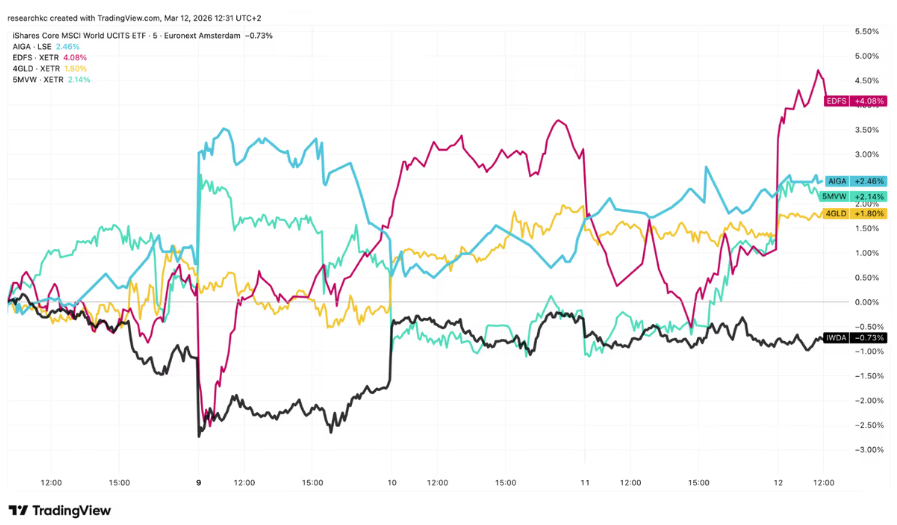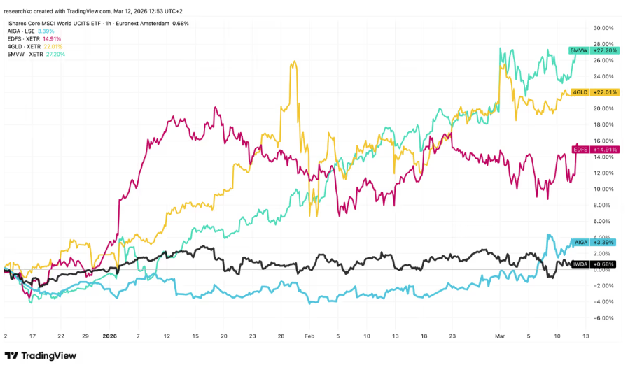 Eurooppalaiseen puolustusteollisuuteen sijoittava Amundi STOXX Europe Defense ETF (EDFS), maataloushyödykkeisiin sijoittava WisdomTree Agriculture (AIGA), energiasektoriin sijoittava iShares MSCI World Energy Sector (5MVW) ja kultaan sijoittava Xetra Gold (4GLD) ovat viimeisen viikon aikana olleet kaikki vahvassa nousussa.