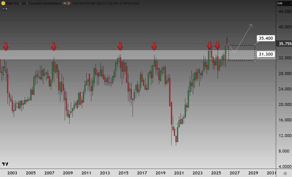 Shell on listattu myös Euronext Amsterdamissa tunnuksella SHELL, ja siellä kuva näyttää vielä vahvemman psykologisen esteen: vastustason, joka piti pintansa 24 vuoden ajan…