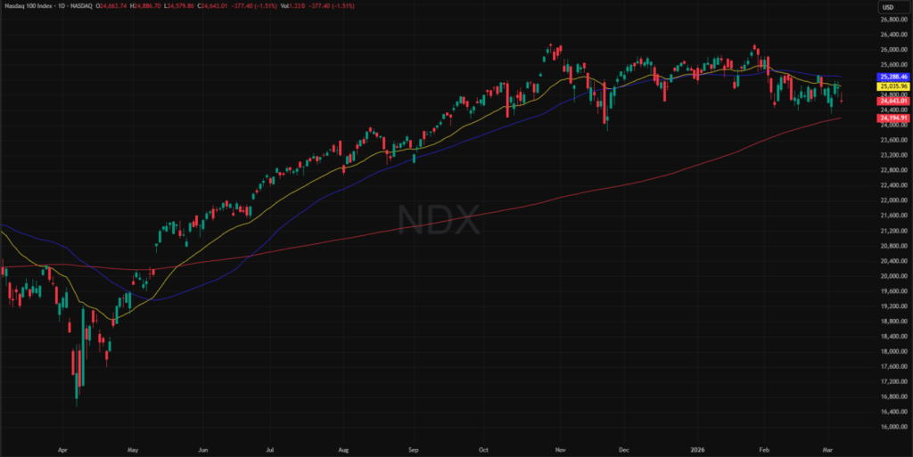S&P 500 indeksin tekninen kuva heikkeni edellisellä viikolla kokonaisuutta tarkastellessa. Indeksi teki myös uudet vuoden 2026 pohjat hintatasossa ~$6 710. Hinta pysytteli koko viikon ajan graafilla näkyvien lyhkäisempien liukuvien keskiarvojen alapuolella (EMA25, SMA50). EMA25 on myös kääntynyt selkeään laskusuuntaan. Hinta rikkoi myös 2025 loppuvuoden sekä alkuvuoden 2026 pohjista piirretyn nousevan trendilinjan alaspäin, mikä asettaa indeksin teknistä kuvaa heikomaksi. Huomoksi voidaan nostaa myös lokakuun 2025 alun huiput hintatasossa ~$6 765, jonka alapuolelle hinta valui viikon loppupuolella sekä sulkeutui tämän hintatason alapuolelle.