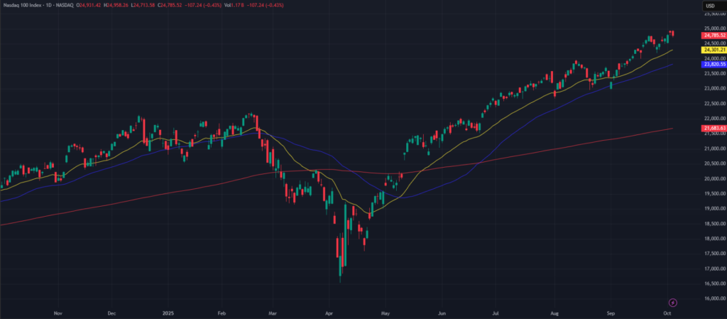 Indeksin tekniseen kuvaan ei ole tullut suurta päivitettävää edelliseen markkinakatsaukseen verraten. Nousutrendi pysyy edelleen vahvana, ja hinta on kaikkien graafilla näkyvien liukuvien keskiarvojen yläpuolella. Näiden järjestys pysyy myös edelleen nousutrendin mukaisena. NASDAQ pääsi myös rikkomaan aikaisemman ATH-lukeman ylöspäin keskiviikkona, mutta palautui loppuviikon aikana vanhan ATH-lukeman tasoille (~24 785$). Kyseinen taso voi toimia mahdollisena tukitasona, mutta hinnan rikkoessa se alaspäin, voi kyseinen taso muodostua mahdolliseksi vastustasoksi. Samaa näkemystä voi myös pohtia S&P500 indeksin ja graafin osalta.