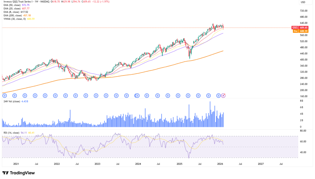 - QQQ (Nasdaq 100 ETF): Tekninen kuva on aavistuksen heikompi kuin SPY:ssä. QQQ on 8 viikon EMA:n alapuolella, mutta edelleen muiden keskeisten liukuvien (esim. 20/50 viikon) yläpuolella, eli kyse näyttää toistaiseksi enemmän “jäähdyttelyltä” kuin selvältä trendin rikkoutumiselta.