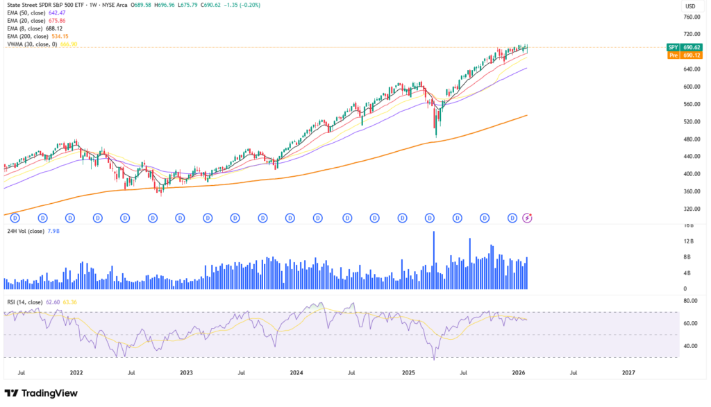 - SPY (S&P 500 ETF): Trendikuva on edelleen rakentava. SPY pysyy 8 viikon EMA:n yläpuolella, mikä viittaa siihen, että lyhyen aikavälin nousurakenne on yhä voimassa ja dippejä on toistaiseksi ostettu.