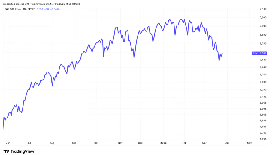 Tällä hetkellä asetamme vedenjakajaksi 6 720 pisteen tason. Tämä on taso, johon S&P 500 -indeksi sulkeutui tiistaina 17.3.2026 voimakkaan pompun päätteeksi. Mikäli näkisimme tämän tason ylittyvän, pitäisimme aiheellisena avata ovea mahdollisuudelle, että olemme siirtyneet takaisin nousutrendiin.