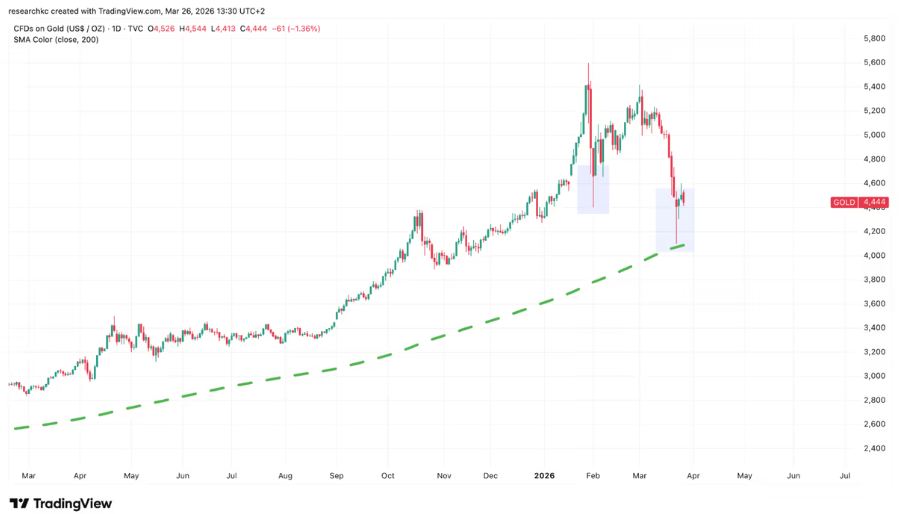 Kullan hinta on alkuvuoden 2026 aikana tarjonnut sekä voimakkaita nousuja että laskuja. Viimeisen viikon aikana näimme jälkimmäistä kullan hinnan käydessä lyhyesti koskettamassa 200 päivän liukuvaa keskiarvoaan.