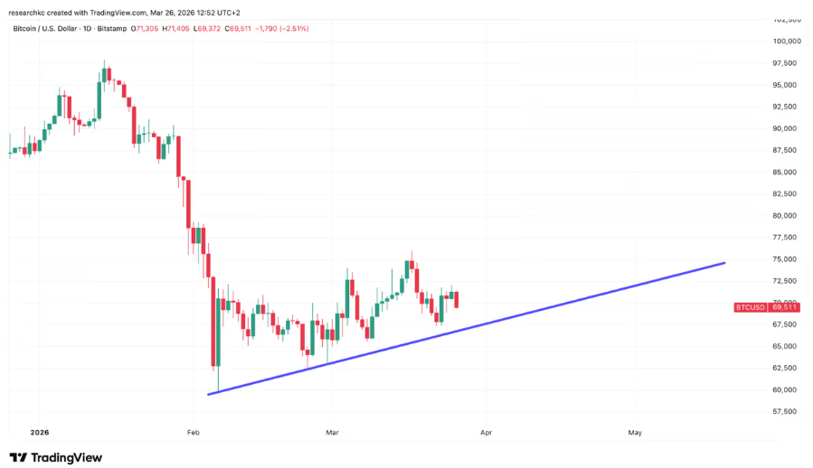 Bitcoinin kurssi on helmikuun alusta alkaen tehnyt nousevia pohjia, eikä Lähi-idän konfliktin alkaminen juurikaan näy sen kurssikehityksessä.