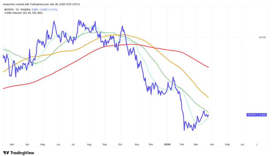 Jos vertaamme bitcoinin kurssia (referenssinä BTC ETF -rahasto IBIT) S&P 500 -indeksiin, voimme nähdä, että tämä suhdeluku on ylittänyt 20 päivän liukuvan keskiarvonsa, mutta on vielä alle kaikkien muiden keskeisten liukuvien keskiarvojen.