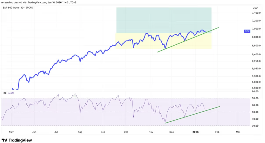 S&P 500 on pysynyt kirkkaasti yli rajapyykiksi asettamamme 6850 pisteen tason. Sen osalta alkaa näyttää yhä selkeämmin siltä, että marras-joulukuun poikittaisliike alkaa olla on taakse jäänyttä, ja kurssi kääntynyt yksiselitteiseen nousutrendiin.