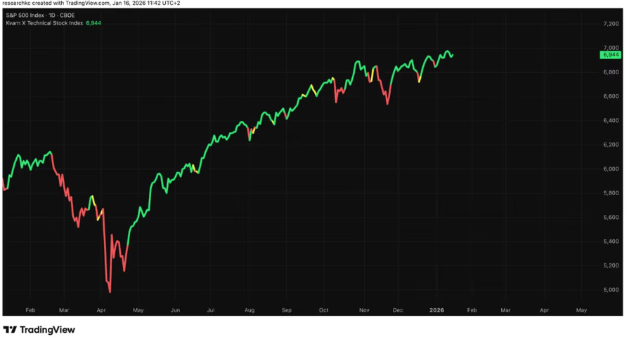 Indeksin siirtyessä takaisin trendinomaiseen liikkeeseen, annamme lisää painoarvoa ensisijaiselle trendinseuranta-indikaattorillemme, Kvarn X Technical Stock Indexille. Tämä indikaattorin hyödyllisyys heikkenee poikittaisliikkeiden aikana, mutta trendinomaisessa kehityksessä se toimii varsin hyvin trendin voimassa pysymisen seuraamiseen.