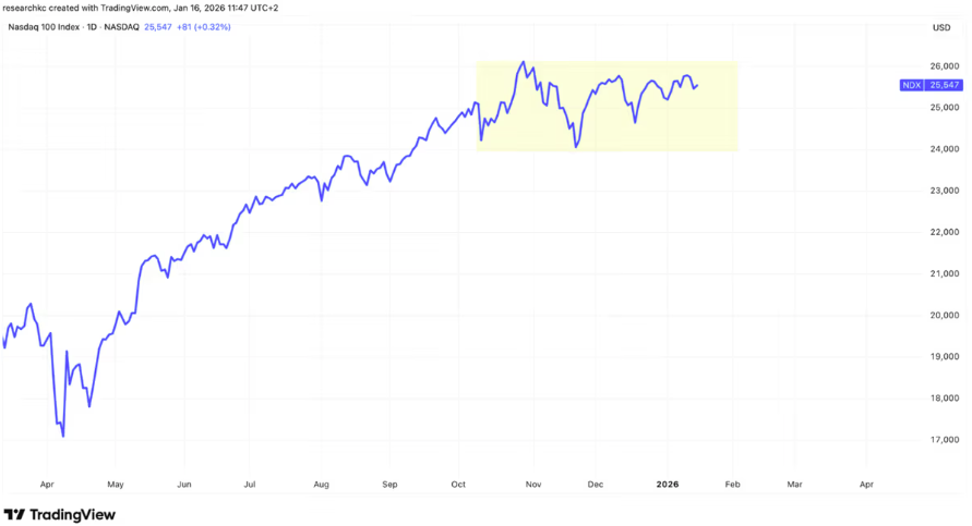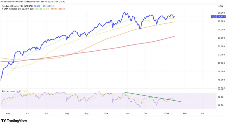 Siinä missä S&P 500 huitelee jo uusissa ennätyslukemissaan, Nasdaq 100-indeksi ei ole vieläkään noussut lokakuun lopussa nähtyjen omien ennätyslukemiensa yläpuolelle, eikä se ole ylittänyt viime viikolla vedenjakajaksi määrittämäämme 26 000 pisteen rajaa. Indeksi on kulkenut jo lähes kolme kuukautta poikittaisliikkeessä.
