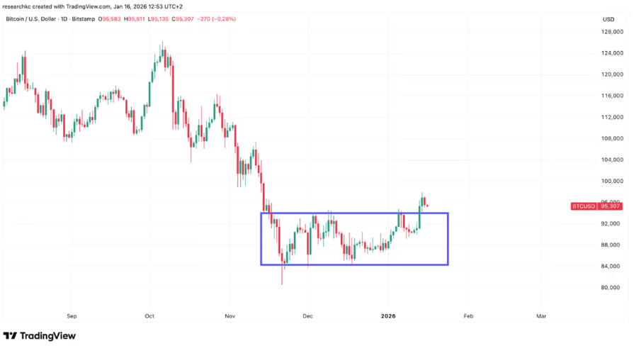 Viikko myöhemmin tarkasteltuna näyttää, että break-out todella on tapahtunut. Bitcoinin kurssi on kohonnut yli 95 000 dollarin, ja se näyttäisi olevan valmis uuteen nousutrendiin.