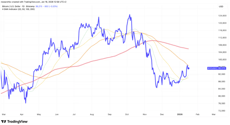 Viime viikkojen kurssinoususta huolimatta bitcoinin kurssi on vielä usein keskeisinä pidettyjen 100 päivän ja 200 päivän liukuvien keskiarvojen alapuolella, kuten ovat myös kurssin 20 päivän ja 50 päivän liukuvat keskiarvot.