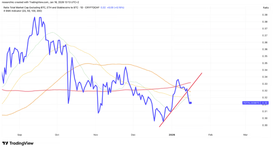 Alt-coin-markkinan ja bitcoinin markkina-arvojen suhdetta kuvaava TOTAL3ESBTC-suhdeluku on parin vahvan viikon jälkeen kääntynyt jälleen laskusuuntaan, ja pudonnut keskeisten liukuvien keskiarvojensa alapuolelle.