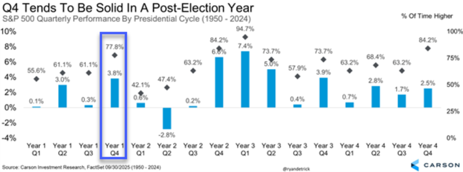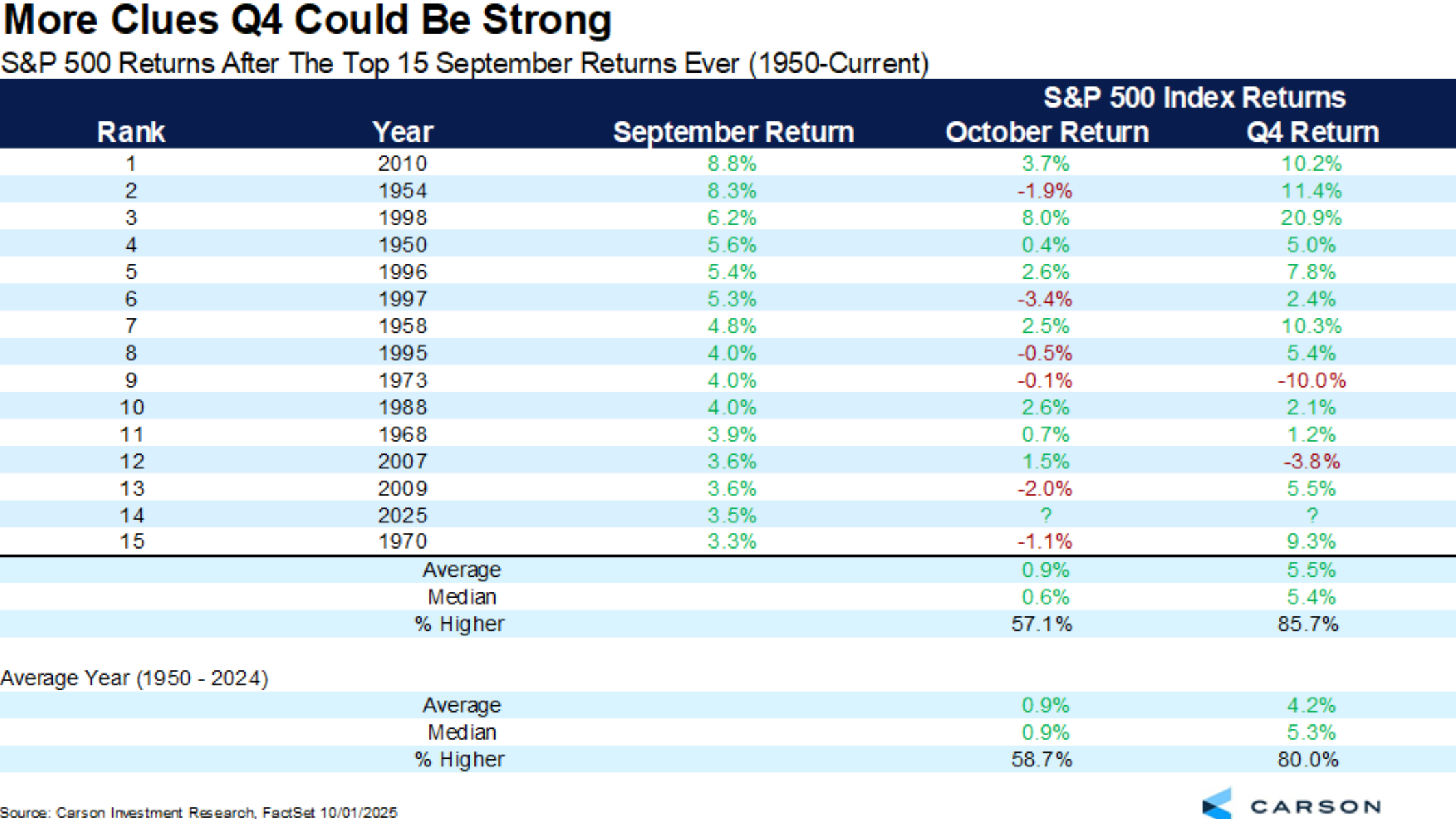 Jos historiaa voi käyttää oppaana, Q4:stä on tulossa vahva kokonaisuus. Kun Q3 on ollut vahva, Q4:n keskimääräinen tuotto on +5,4 % ja osumaprosentti 85,7 % – sekä tuotto että osumatarkkuus ovat korkeammat kuin kaikissa Q4-jaksoissa keskimäärin vuodesta 1950 alkaen.