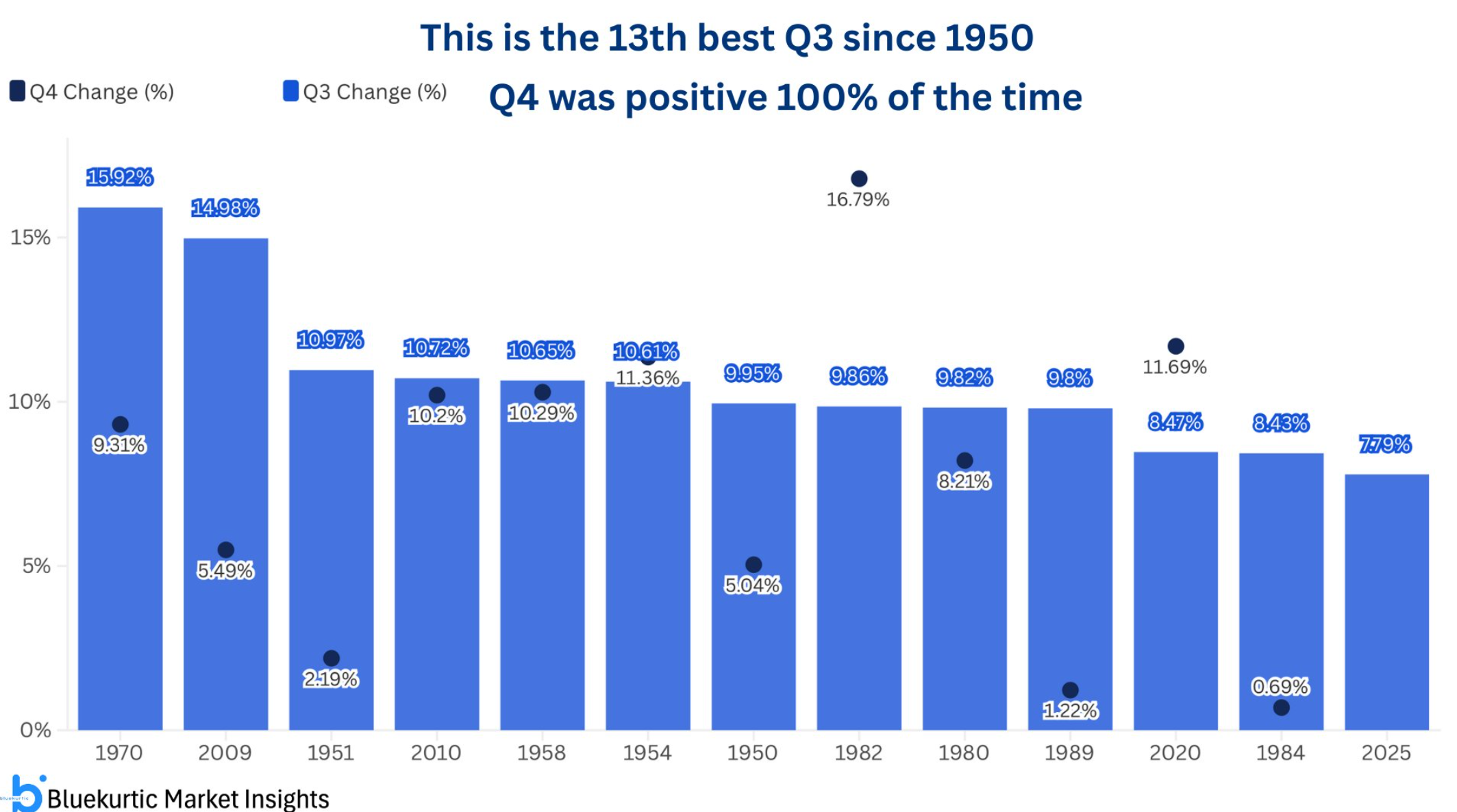 Q3 oli kokonaisuutena 13:nneksi vahvin kolmas neljännes vuodesta 1950 lähtien, S&P 500 +7,79 %. Kaikilla muilla 12 kerroilla tällaisen Q3:n jälkeen Q4 on ollut korkeammilla tai selvästi korkeammilla tasoilla.