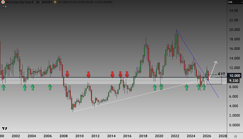 Stora Enso on noussut jälleen tarkkailuun. Osake on palannut hintavyöhykkeelle, jolla on ollut merkittävä rooli jo noin 26 vuoden ajan. Tämä alue on toiminut toistuvasti sekä tukena että vastuksena, ja nyt osake on noussut jälleen sen yläpuolelle, mikä viittaa siihen, että taso toimii taas tukialueena.