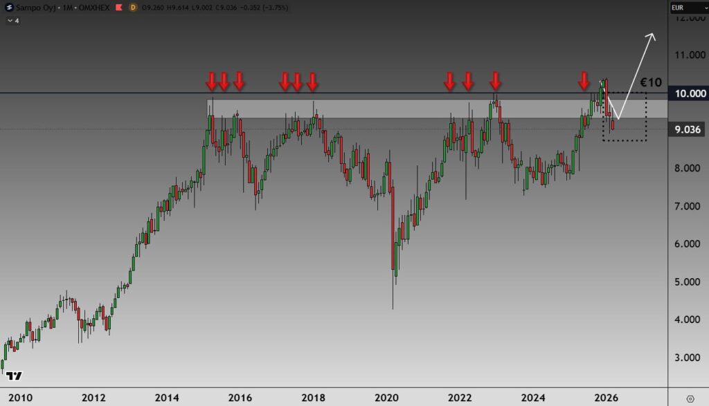 Tällä hetkellä kurssi lähestyy aluetta yläpuolelta, joten kyseinen vyöhyke toimii tukena. Samalla kokonaiskuvaa tukevat myös useat muut tekijät: pyöreä 10 euron taso, noin 50 prosentin lasku huipuista, alkuvuodesta 2022 alkaneen laskevan trendiviivan murtuminen sekä vuodesta 2009 asti ulottuva trendiviiva, joka osaltaan vahvistaa alueen merkitystä.
