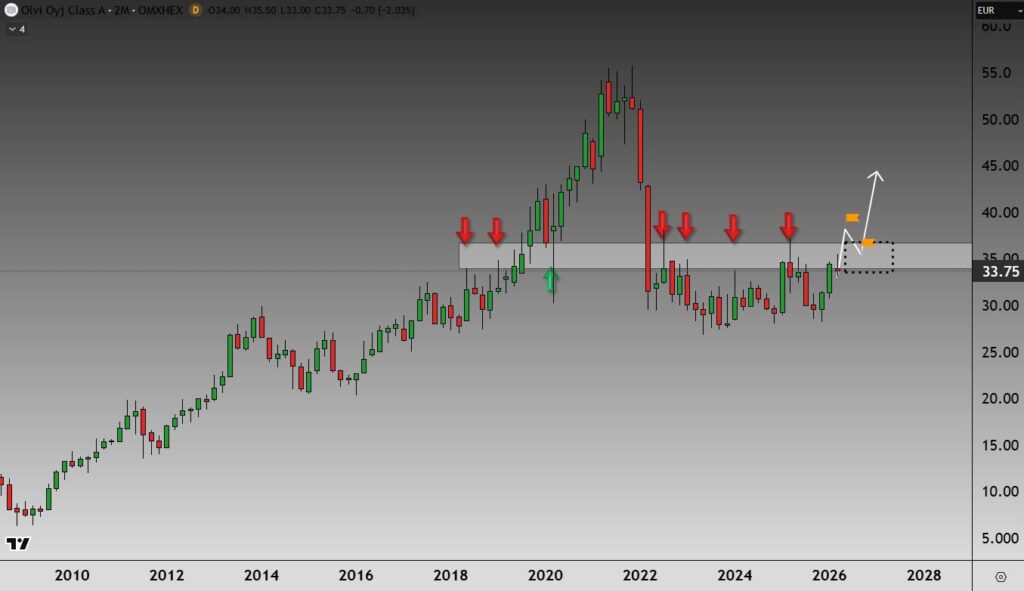 Tässä vaiheessa en kuitenkaan lähtisi mukaan ilman vahvistusta. Seuraan kuukausisulkeutumista 38 euron yläpuolelle, sillä silloin osake murtaisi alueen, jonka läpi se on yrittänyt päästä jo noin neljän vuoden ajan.