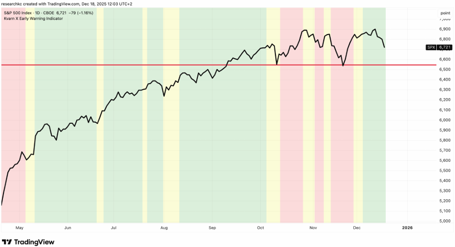 - Osakemarkkinan nousun veturina toimineen teknologiasektorin heikkous pakottaa varautumaan myös siihen mahdollisuuteen, että koko osakemarkkina saattaisi olla kääntymässä syvempään laskuun. Toistaiseksi tämä on vielä vasta hypoteesi, mutta mielestämme sellaisenakin seuraamisen arvoinen. Hypoteesi saisi merkittävää tukea, mikäli S&P 500-indeksi laskisi alle 6550 pisteen ja/tai näkisimme markkinan hermostuneisuutta indikoivan Kvarn X Early Warning Indicatorin kääntyvän punaiseen väriin.