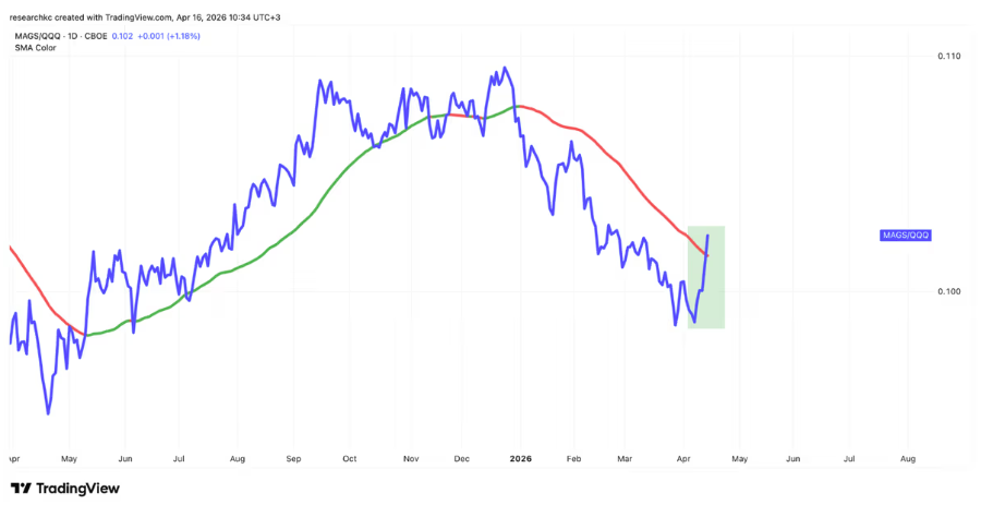 Teknologiasektorin sisällä voimme tarkastella suurimpia teknologiayhtiöitä, ns. Magnificent Seven -ryhmää. Alla olevasta graafista voimme nähdä, että Mag 7 -yhtiöitä edustava MAGS on vuoden 2026 aikana selkeästi heikentynyt muuta Nasdaq 100 -indeksiä vastaan, mutta viimeisen viikon aikana se on suorastaan hypännyt ylöspäin.