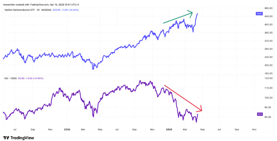 Teknologiasektorin sisällä puolestaan voimme nähdä selvän erkanemisen tekoälybuumiin läheisesti liittyvän puolijohdesektorin (SMH) ja ohjelmistosektorin (IGV) välillä.