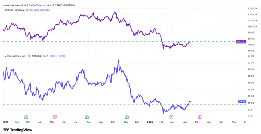 Alla olevasta graafista voidaan nähdä, että suurimman kryptovaluutan, Bitcoinin, kurssi näyttäisi olevan kipuamassa yli maaliskuun paikallisen huipun. Samaan aikaan suurimpiin bitcoin-louhijoihin kuuluvan MARA Holdingsin (MARA) kurssi on jo ylittänyt maaliskuisen huipun.